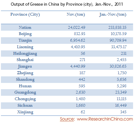 Output of Grease in China by Province (city), Jan.-Nov., 2011