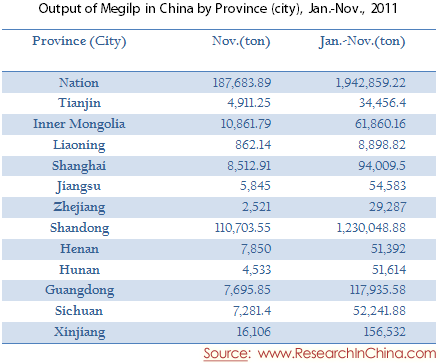 Output of Megilp in China by Province (city), Jan.-Nov., 2011