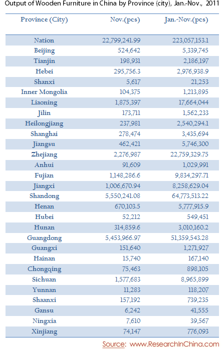 Output of Wooden Furniture in China by Province (city), Jan.-Nov., 2011