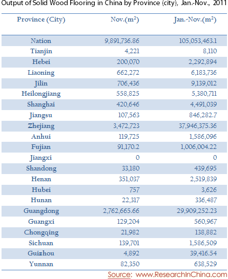 Output of Solid Wood Flooring in China by Province (city), Jan.-Nov., 2011