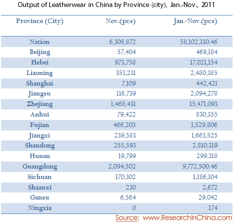 Output of Leatherwear in China by Province (city), Jan.-Nov., 2011
