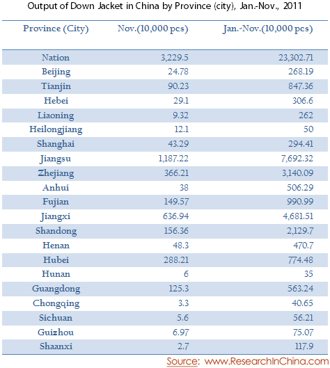 Output of Down Jacket in China by Province (city), Jan.-Nov., 2011