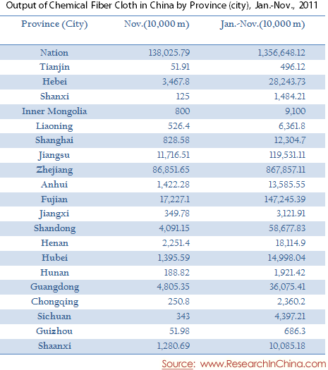 Output of Chemical Fiber Cloth in China by Province (city), Jan.-Nov., 2011