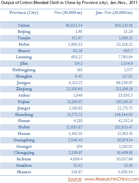 Output of Cotton Blended Cloth in China by Province (city), Jan.-Nov., 2011