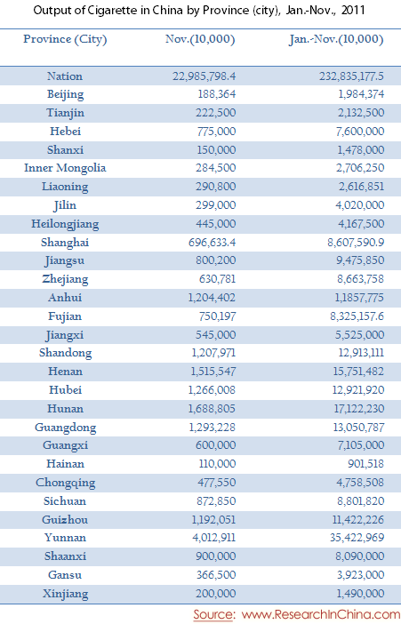 Output of Cigarette in China by Province (city), Jan.-Nov., 2011