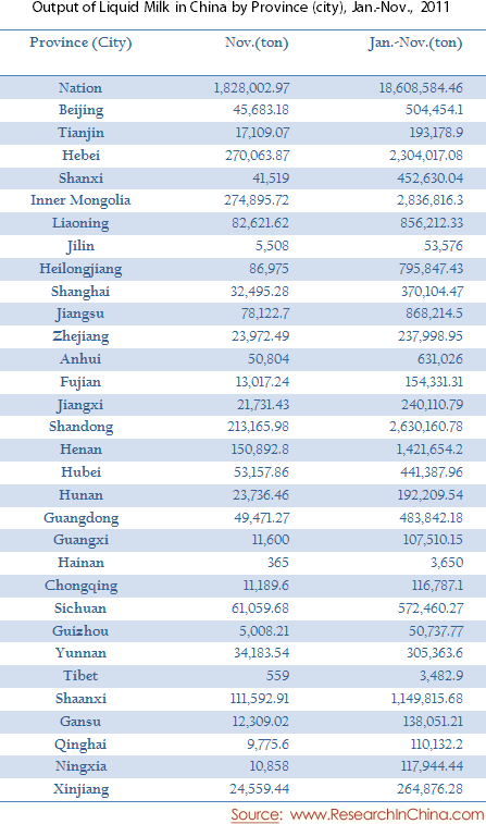 Output of Liquid Milk in China by Province (city), Jan.-Nov., 2011