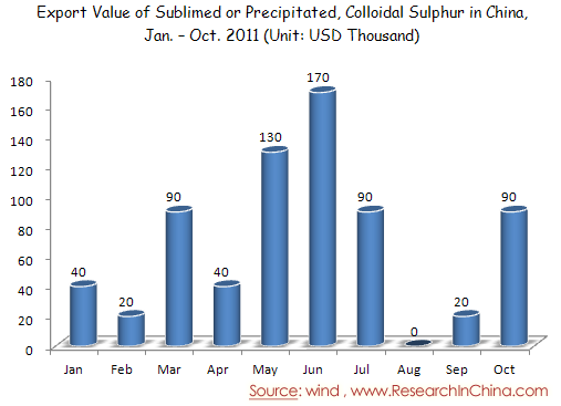 Export Value of Sublimed or Precipitated, Colloidal Sulphur in China, Jan. – Oct. 2011