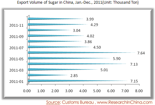 Export Volume of Sugar in China, Jan.-Dec., 2011