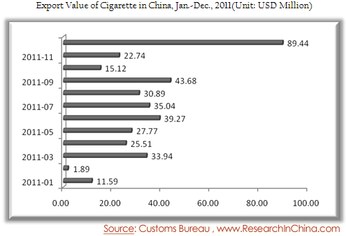 Export Value of Cigarette in China, Jan.-Dec., 2011