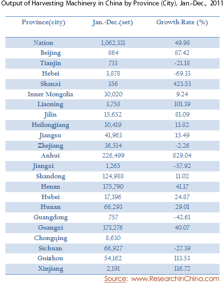 Output of Harvesting Machinery in China by Province (City), Jan.-Dec., 2011