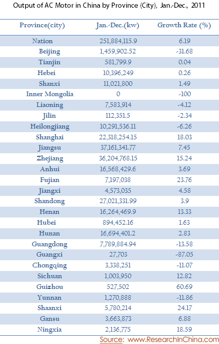 Output of AC Motor in China by Province (City), Jan.-Dec., 2011