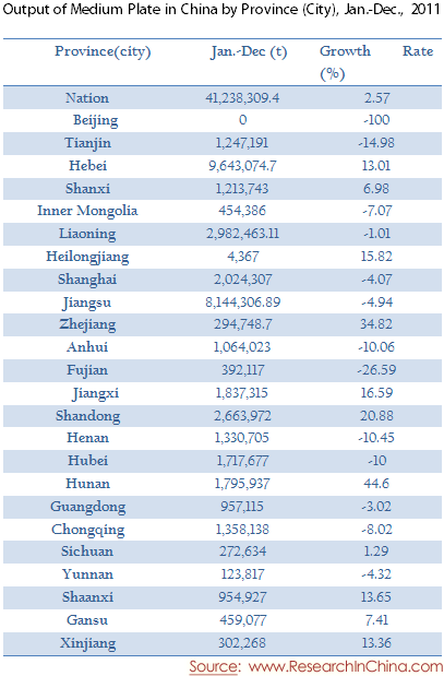 Output of Medium Plate in China by Province (City), Jan.-Dec., 2011