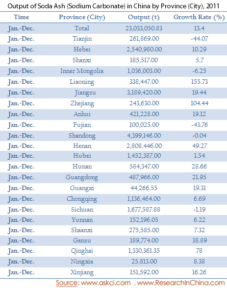 Output of Soda Ash (Sodium Carbonate) in China by Province (City), 2011
