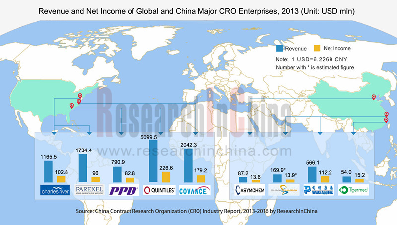 Revenue and Net Income of Global and China Major CRO Enterprises, 2013 (Unit: USD mln)