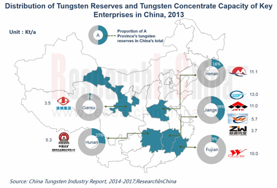 Distribution of Tungsten Reserves and Tungsten Concentrate Capacity of Key Enterprises in China, 2013