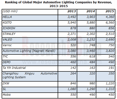 Ranking of Global Major Automotive Lighting Companies by Revenue, 2013-2015
