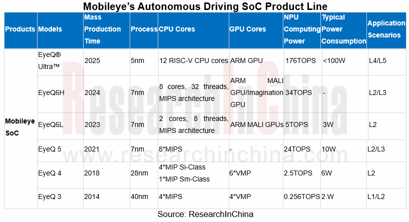 In this context, ADAS/autonomous driving chips have seen a wave of upgrades, and many chip makers have launched or planned to unveil high computing power chips. In January 2022, Mobileye introduced the EyeQ? Ultra?, the company’s most advanced, highest performing system-on-chip (SoC) purpose-built for autonomous driving. As unveiled during CES 2022, EyeQ Ultra maximizes both effectiveness and efficiency at only 176 TOPS, with 5 nanometer process technology. Although it looks less potent than chips from rivals Qualcomm and NVIDIA, the cost-effective and high-energy-efficiency EyeQ? Ultra? may still be favored by OEMs.