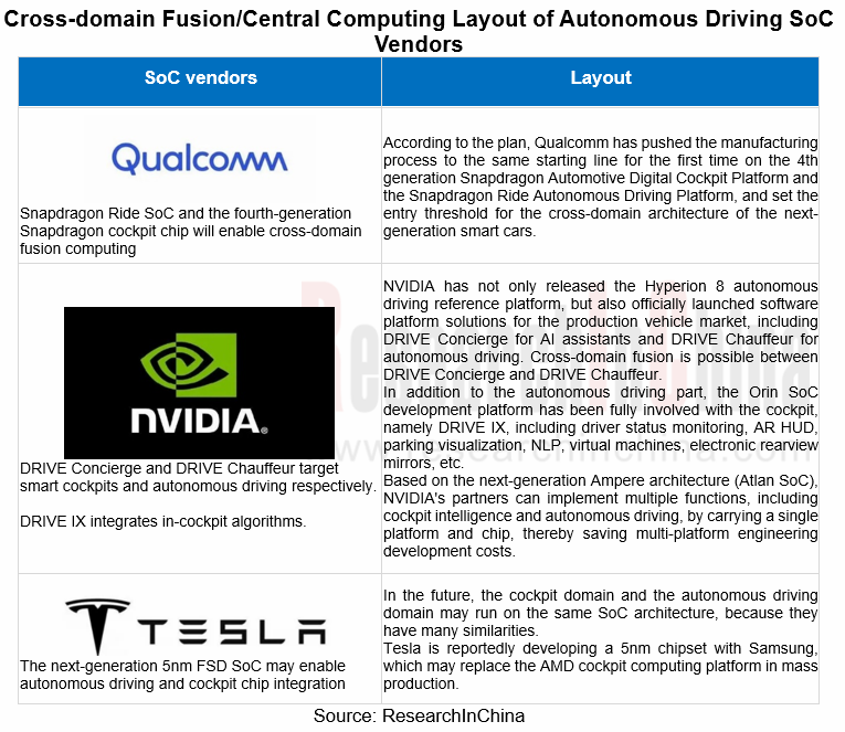 The industry’s giants like NVIDIA and Qualcomm have all begun to implement cross-domain integration of autonomous driving and cockpits. For example, NVIDIA has launched DRIVE Concierge and DRIVE Chauffeur for smart cockpits and autonomous driving respectively. DRIVE IX can realize the fusion of algorithms in the cockpit. Based on the powerful software stack tools, NVIDIA's next-generation Ampere architecture (Atlan SoC) will conduct the simultaneous control over autonomous driving and intelligent cockpit with a single chip.