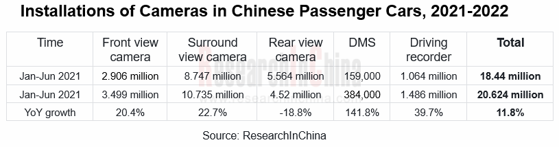 According to ResearchInChina, China installed 20.624 million cameras in new cars in 2022H1, a year-on-year increase of 11.8%. By market segments, the installations of front view cameras increased by 20.4% year-on-year to 3.499 million units in 2022H1; the installations of surround view cameras jumped by 22.7% year-on-year to 10.735 million units; the installations of rear view cameras decreased by 18.8% year-on-year to 4.52 million units; the installations of DMS cameras swelled by 141.8% year-on-year to 384,000 units; the installations of driving recorders ascended by 39.7% year-on-year to 1.486 million units.