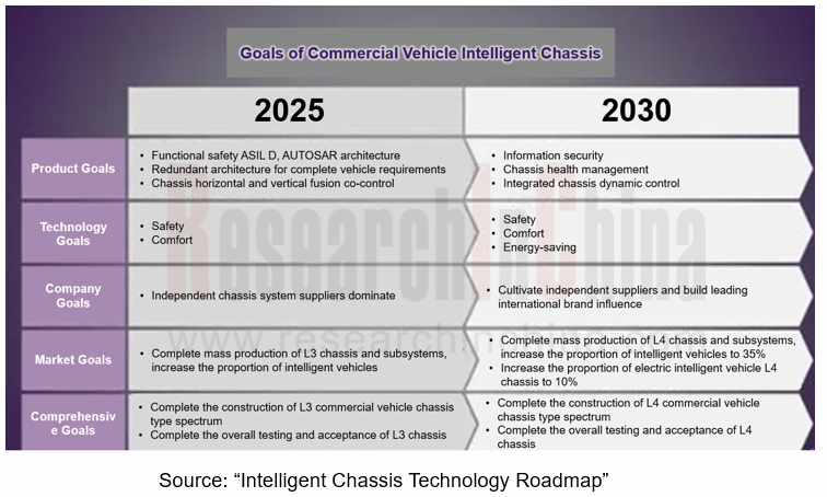 According to the “Intelligent Chassis Technology Roadmap” published by the Electric Vehicle Alliance Wire-Controlled Working Group in 2021, the goals for the development of intelligent chassis for commercial vehicles are shown in the following diagram: