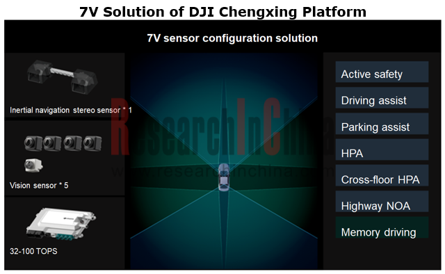 In December 2023, Chery iCAR 03 was released for global pre-sale. The Intelligent Driving Edition of iCAR 03 packs the 7V vision-only solution of DJI Chengxing Platform, with sensors including a pair of 8MP front view inertial navigation stereo cameras, a 3MP rear view mono camera and four 3MP surround view fisheye cameras. This solution enables memory driving, highway NOA, cross-floor home-zone parking assist and other functions. It costs about RMB5,000.