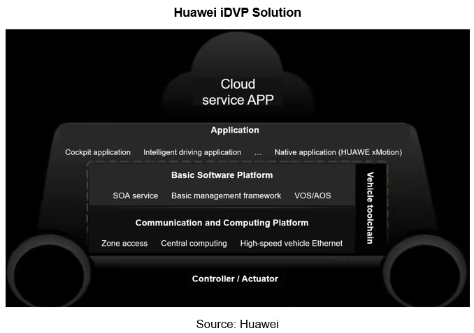 In April 2023, Huawei launched iDVP Intelligent Digital Vehicle Platform (i.e., vehicle operating system), which is a digital base designed based on SOA architecture, integrating functions of Huawei's various domain operating systems (AOS, HOS, and VOS), and realizing decoupling of software and hardware through atomic service layer, thus realizing rapid adaptation for cross-model development.