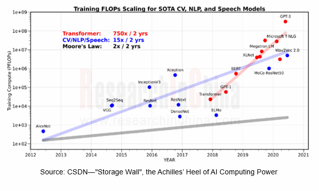 The popularity of ChatGPT indicates the development directions of autonomous driving: foundation models and high computing power. For large neural network models such as Transformer, the computation will multiply by 750 times every two years on average; for video, natural language processing and speech models, the computation will increase by 15 times every two years on average. It is conceivable that Moore's Law will cease to apply, and the "storage wall" and "power consumption wall" will become the key constraints on the development of AI chips.