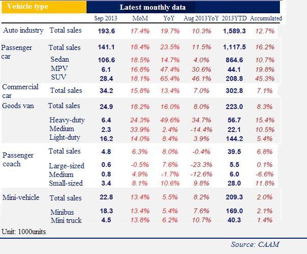 Vehicle Sales Volume in China by Type, Sep. 2013