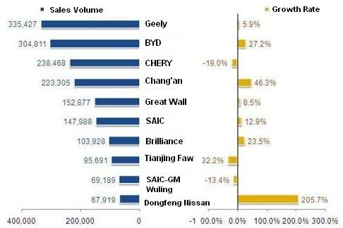 Sales Volume and Growth of China Top 10 Carmakers with Independent Brands, Jan.-Sep. 2013