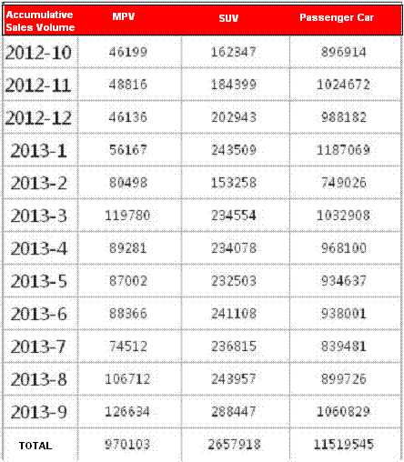 Sales Volume of SUV and MPV in China, Jan.- Sep. 2013