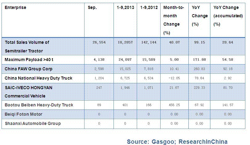 Sales Volume of Semitrailer Tractor (>40 t), Sep., 2013