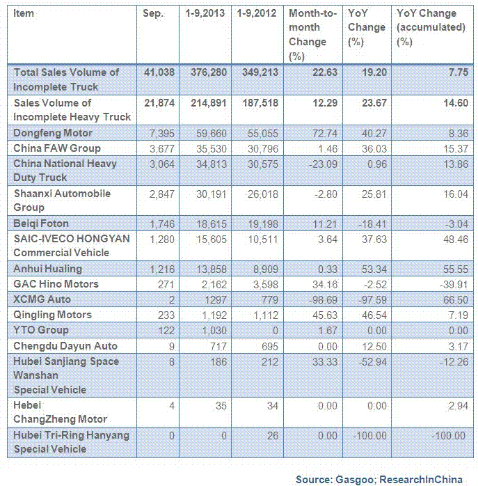 Sales Volume of Incomplete Heavy Truck in China, Sep., 2013