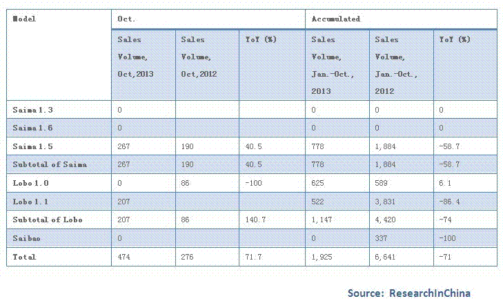 Sales Volume of Hafei Auto by Model, Oct., 2013