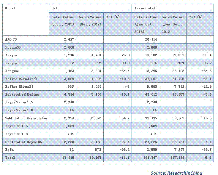 Sales Volume of JAC Motor by Model, Oct., 2013