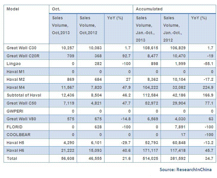Sales Volume of Great Wall Automobile by Model, Oct., 2013