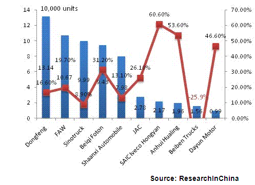 Sales Volume and YoY of Top 10 Heavy Truck Companies in China, Jan. – Oct., 2013