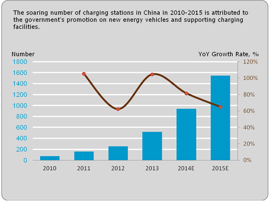 Number of Chinese Charging Stations and YoY Growth Rate, 2010-2015E