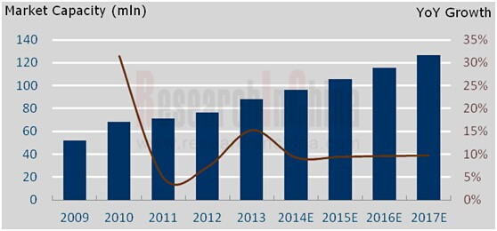 China's Automotive Door Panel Market Capacity and YoY Growth, 2009-2017E