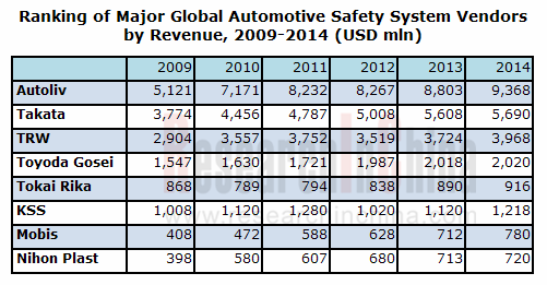 Ranking of Major Global Automotive Safety System Vendors by Revenue, 2009-2014 (USD mln)
