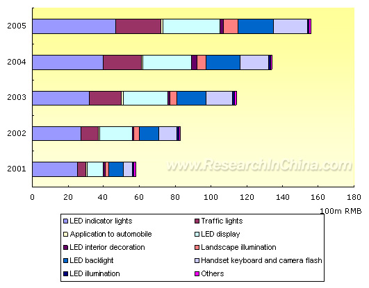 As LED technology continues developing and shows advantages of low consumption, long life-span and environmental protection, its application has shifted from initial indicator light to such more potential fields as display panels, illumination, backlight, automobile lights and traffic lights, etc. Now LED application is developing in a diversified way. Demand for normal brightness still ranks first in China's LED market; however, the market of high brightness and super high brightness LED has even greater potential. Traditional red and green LED are widely drawn on in China. AlGaInP LED is still the mainstream and GaN LED is increasing sharply. The year of 2005 witnessed a growth rate of 18.4% in China's LED market.