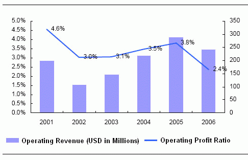 Statistics of Operating Revenue and Profit Ratio of Jabil, 2001-2006