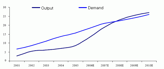 China's Alumina Output and Demand, 2001-2010 (million tons)