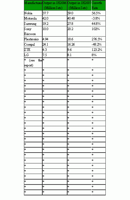 The global sale of mobile phone amounted to 515 million sets in the first half of 2007, of which 81million sets (taking 15.7%) were distributed in Mainland China.